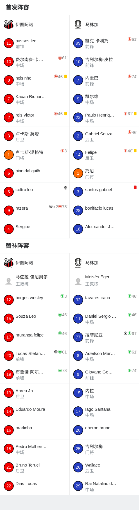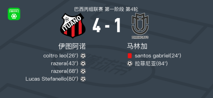 北京时间4月27日巴西丙组联赛 第一阶段 第4轮,伊图阿诺主场对阵马林加。伊图阿诺coltro leo破门,razera梅开二度,Lucas Stefanello破门。马林加拉菲尼亚破门。最终比分伊图阿诺 4–1 马林加。