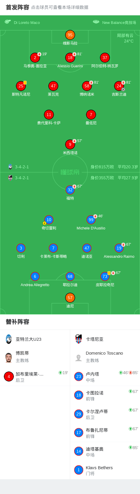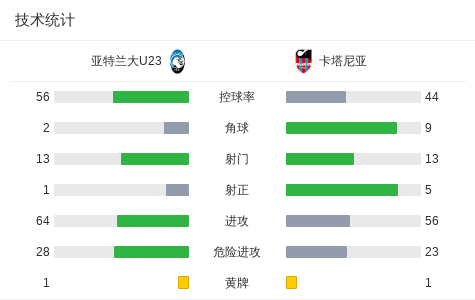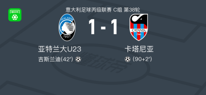 亚特兰大U23 1-1卡塔尼亚 足球资讯 发布时间: 2026年4月27日 阅读时间: 少于1 分钟 FacebookXPinterestWhatsApp 亚特兰大U23 1-1卡塔尼亚 北京时间4月27日意大利足球丙级联赛 C组 第38轮,亚特兰大U23主场对阵卡塔尼亚。亚特兰大U23吉斯兰迪破门。最终比分亚特兰大U23 1–1 卡塔尼亚。 点击查看本场比赛详细数据>> 点击查看意丙完整积分榜>> 精彩瞬间 第42分钟,亚特兰大U23球员吉斯兰迪打入一球。 下半场补时第2分钟,卡塔尼亚球员打入一球。 球队阵容 技术统计 FacebookXPinterestWhatsApp 1823100https://1823100.com 红单推荐 003 英冠 南安普顿vs伊普斯维奇 红单推荐 2026年4月28日 004 欧冠 巴黎圣曼vs拜仁 红单推荐 2026年4月28日 007 英超 曼联vs布伦特 红单推荐 2026年4月27日 008 西甲 西班牙人vs莱万特 红单推荐 2026年4月27日 021 西甲 奥萨苏纳vs塞维利亚 红单推荐 2026年4月26日 热门资讯 001 欧联杯 塞尔塔vs弗莱堡 红单推荐 2026年4月16日 002 欧联 诺丁汉vs波尔图 红单推荐 2026年4月16日 001 意甲 莱切vs佛罗伦萨 红单推荐 2026年4月20日 006 欧冠 拜仁vs皇马 红单推荐 2026年4月15日 002 欧协联 巴列卡诺vs雅典AEK 红单推荐 2026年4月9日