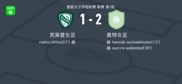 北京时间4月19日挪威女子甲组联赛 联赛 第3轮,克莱普女足主场对阵奥特女足。克莱普女足malou klitte破门。奥特女足hannah aurbekkholen破门,aurora wallestad破门。最终比分克莱普女足 1–2 奥特女足。