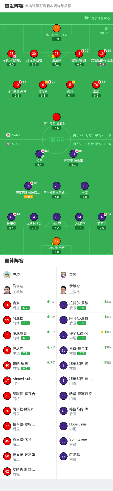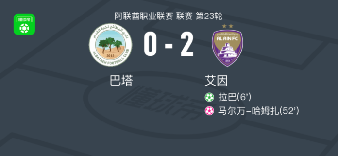 艾因2-0巴塔,拉巴点射 足球资讯 发布时间: 2026年4月24日 阅读时间: 少于1 分钟 FacebookXPinterestWhatsApp 艾因2-0巴塔,拉巴点射 北京时间4月24日阿联酋职业联赛 联赛 第23轮,巴塔主场对阵艾因。巴塔马尔万-哈姆扎自摆乌龙。艾因拉巴破门。最终比分巴塔 0–2 艾因。 点击查看本场比赛详细数据>> 点击查看阿联酋联完整积分榜>> 精彩瞬间 第6分钟,艾因球员拉巴罚入点球。 第52分钟,巴塔球员马尔万-哈姆扎自摆乌龙。 球队阵容 技术统计 FacebookXPinterestWhatsApp 1823100https://1823100.com 红单推荐 005 西甲 巴列卡诺vs西班牙人 红单推荐 2026年4月23日 003 西甲 莱万特vs塞维利亚 红单推荐 2026年4月23日 015 西甲 巴萨vs塞尔塔 红单推荐 2026年4月22日 012 英超 伯恩茅斯vs利兹联 红单推荐 2026年4月22日 007 意杯 国际米兰vs科莫 红单推荐 2026年4月21日 热门资讯 萨拉戈萨U19 0-0乌德山U19,双方握手言和 足球资讯 2026年4月12日 019 英超 曼城vs阿森纳 红单推荐 2026年4月19日 007 英冠 伊普斯维奇vs米德尔斯堡 红单推荐 2026年4月19日 郑大世:森保一执教风格很有人情味;日本队还得日本人执教 足球资讯 2026年4月23日 萨拉赫安菲尔德英超进108球,联赛历史单座球场进球仅次于亨利 足球资讯 2026年4月12日
