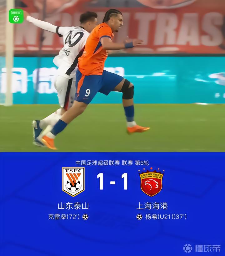 【山东1-1残阵海港,杨希破门,克雷桑神仙球扳平,李帅送助攻】