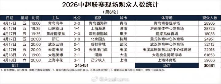 中超第6轮观众人数:梭鱼湾最高;场均超3万人 足球资讯 发布时间: 2026年4月19日 阅读时间: 少于1 分钟 FacebookXPinterestWhatsApp 中超第6轮观众人数:梭鱼湾最高;场均超3万人 4月18日晚上,中超联赛第6轮全面结束,共有24万5451人现场观看了比赛,场均超过了3万人。 本轮赛事,大连梭鱼湾球场依然获得了上座头筹,他们有61653名观众入场,而上海申花主场39056人排名第二。 其他场次均没有突破3万,其中有5场都是2万多人,最低是重庆铜梁龙的铜梁主场,仅有18033人。 具体数据见下图 FacebookXPinterestWhatsApp 1823100https://1823100.com 红单推荐 023 英超 阿森纳vs纽卡斯尔 红单推荐 2026年4月25日 016 英超 狼队vs热刺 红单推荐 2026年4月25日 013 英超 桑德兰vs诺丁汉 红单推荐 2026年4月24日 014 西甲 贝蒂斯vs皇马 红单推荐 2026年4月24日 005 西甲 巴列卡诺vs西班牙人 红单推荐 2026年4月23日 热门资讯 001 意甲 莱切vs佛罗伦萨 红单推荐 2026年4月20日 003 英超 水晶宫vs西汉姆联 红单推荐 2026年4月20日 016 英超 狼队vs热刺 红单推荐 2026年4月25日 三人20+!火箭21分逆转太阳7连胜 KD24分阿门22+11+8 篮球资讯 2026年4月8日 约基奇第198次三双!掘金大胜灰熊豪取10连胜 穆雷26+7+5 篮球资讯 2026年4月9日