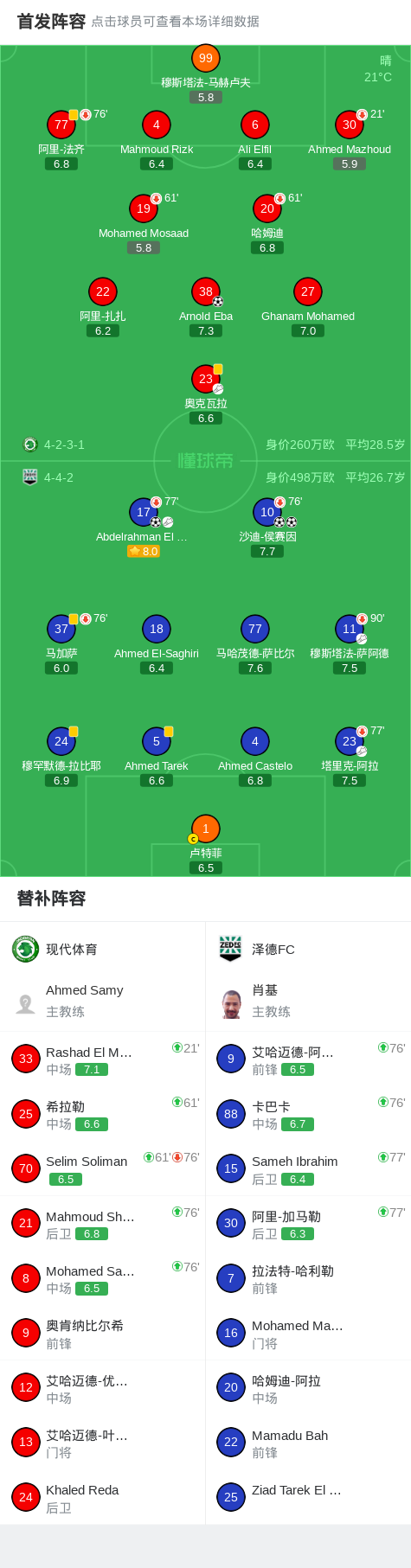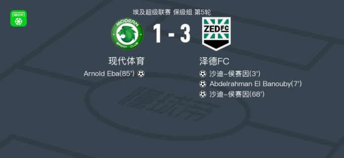 北京时间4月20日埃及超级联赛 保级组 第5轮,现代体育主场对阵泽德FC。现代体育Arnold Eba破门。泽德FC沙迪-侯赛因梅开二度,Abdelrahman El Banouby破门。最终比分现代体育 13 泽德FC。