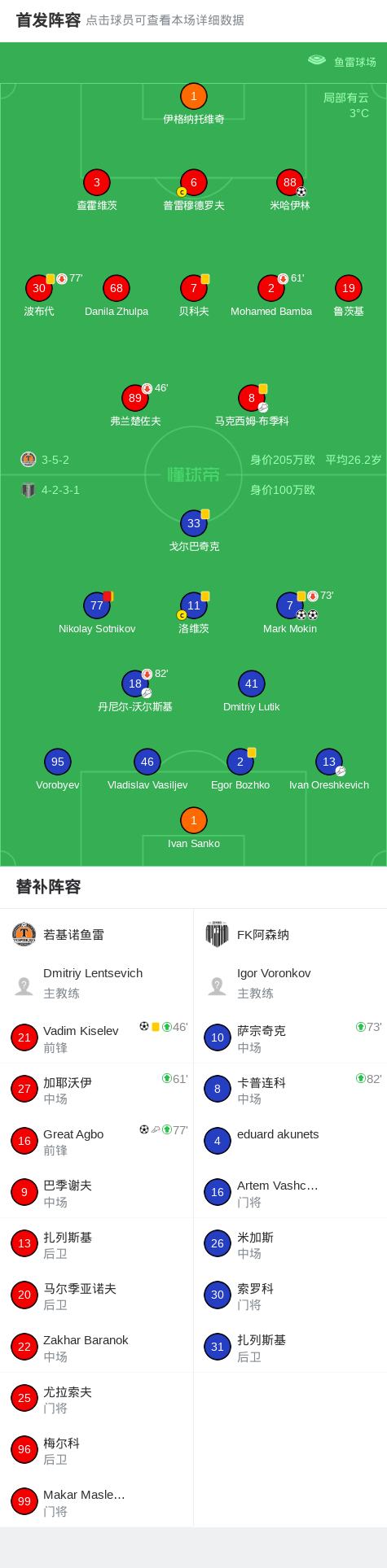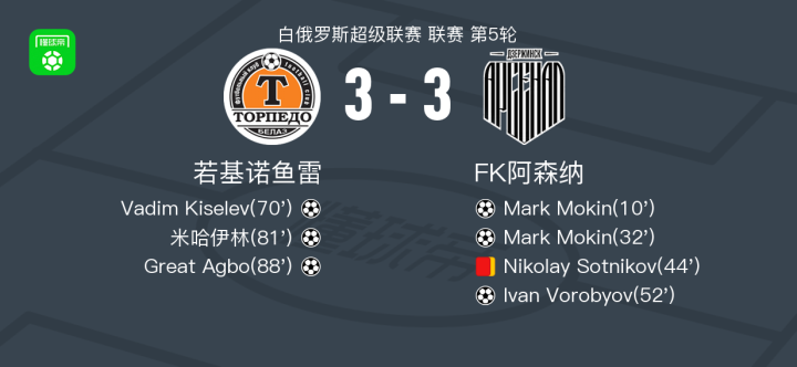 北京时间4月27日白俄罗斯超级联赛 联赛 第5轮,若基诺鱼雷主场对阵FK阿森纳。若基诺鱼雷Vadim Kiselev破门,米哈伊林破门,Great Agbo破门。FK阿森纳Mark Mokin梅开二度,Ivan Vorobyov破门。最终比分兹霍迪诺 3–3 FK阿森纳。