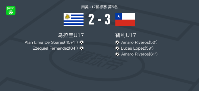 北京时间4月19日南美U17锦标赛 第5名,乌拉圭U17对阵智利U17。乌拉圭U17Alan Lima De Soares破门,Ezequiel Fernandez破门。智利U17Amaro Riveros梅开二度,Lucas Lopez破门。最终比分乌拉圭U17 2–3 智利U17。