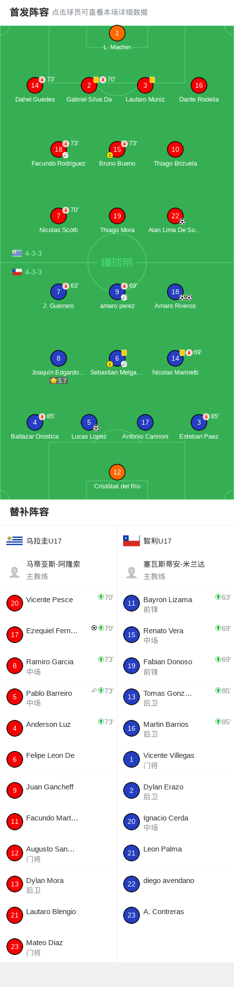 上半场补时第1分钟,乌拉圭U17球员Facundo Rodriguez助攻Alan Lima De Soares打入一球。