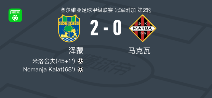 泽蒙2-0马克瓦,米洛舍夫破门,Nemanja Kalat锦上添花 足球资讯 发布时间: 2026年4月22日 阅读时间: 少于1 分钟 FacebookXPinterestWhatsApp 泽蒙2-0马克瓦,米洛舍夫破门,Nemanja Kalat锦上添花 北京时间4月22日塞尔维亚足球甲级联赛 冠军附加 第2轮,泽蒙主场对阵马克瓦。泽蒙米洛舍夫破门,Nemanja Kalat破门。最终比分泽蒙 2–0 马克瓦。 点击查看本场比赛详细数据>> 精彩瞬间 上半场补时第1分钟,泽蒙球员米洛舍夫打入一球。 第68分钟,泽蒙球员Nemanja Kalat打入一球。 球队阵容 技术统计 FacebookXPinterestWhatsApp 1823100https://1823100.com 红单推荐 005 西甲 巴列卡诺vs西班牙人 红单推荐 2026年4月23日 003 西甲 莱万特vs塞维利亚 红单推荐 2026年4月23日 015 西甲 巴萨vs塞尔塔 红单推荐 2026年4月22日 012 英超 伯恩茅斯vs利兹联 红单推荐 2026年4月22日 007 意杯 国际米兰vs科莫 红单推荐 2026年4月21日 热门资讯 萨拉戈萨U19 0-0乌德山U19,双方握手言和 足球资讯 2026年4月12日 萨拉赫安菲尔德英超进108球,联赛历史单座球场进球仅次于亨利 足球资讯 2026年4月12日 萨拉赫英超打入157粒非点球进球,追平阿圭罗列历史第五 足球资讯 2026年4月12日 郑大世:森保一执教风格很有人情味;日本队还得日本人执教 足球资讯 2026年4月23日 萨拉赫英超参与250粒非点球进球,成历史第五人 足球资讯 2026年4月12日