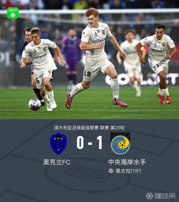 北京时间4月19日澳大利亚足球超级联赛第25轮,奥克兰FC主场对阵中央海岸水手。比赛中,中央海岸水手球员通过配合由奥古拉打入进球。最终比分奥克兰FC 0-1中央海岸水手。