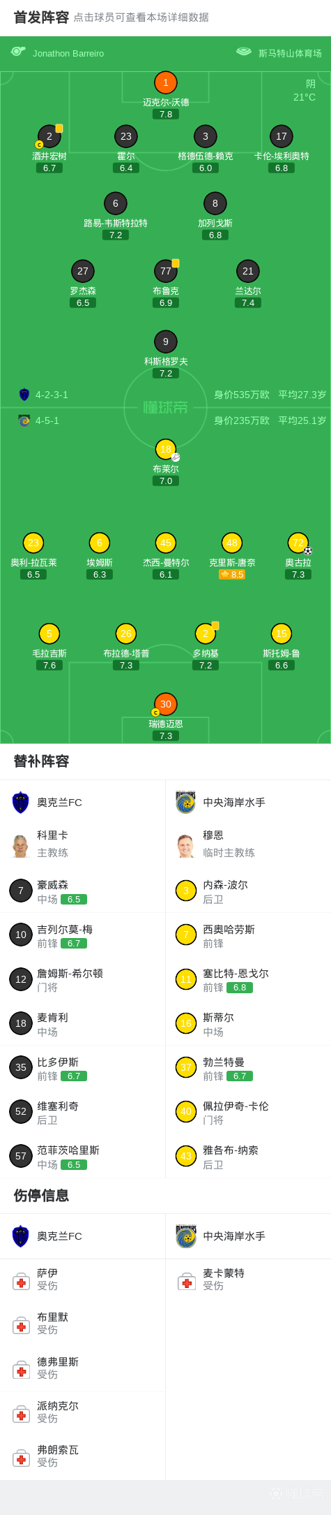 第19分钟,布莱尔斜传,奥古拉推射破门,中央海岸水手1-0奥克兰FC